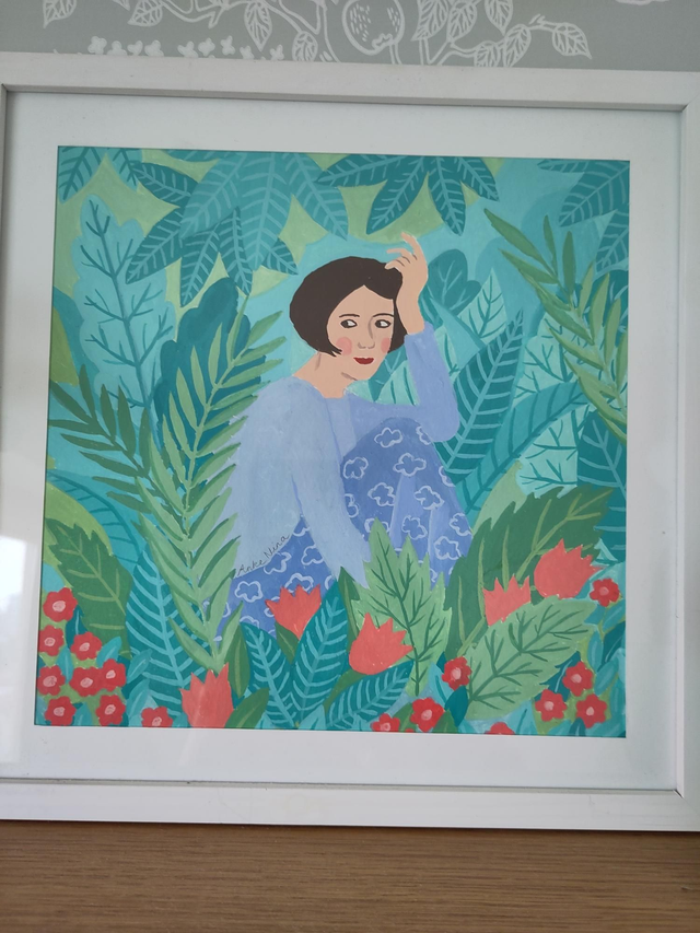 Origineel vierkant schilderijtje in gouache, 20×20cm, ingekaderd in een kader van 26×26cm met passe-partout.